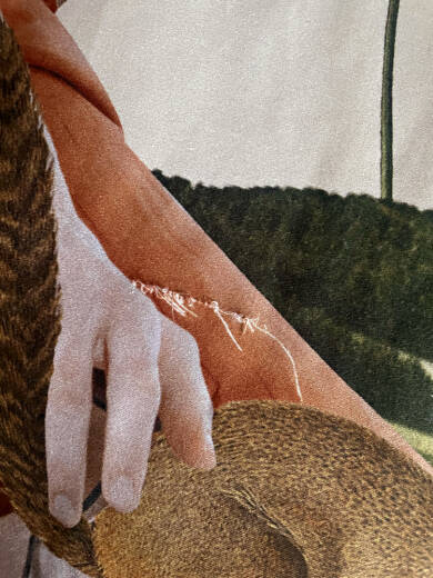 The flaw is about 10 cm, but with a bold pattern like Liquid Memory it’s not very noticeable. It’s located near the bottom edge, approximately 20 cm from the border.